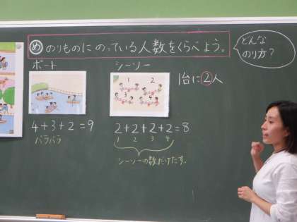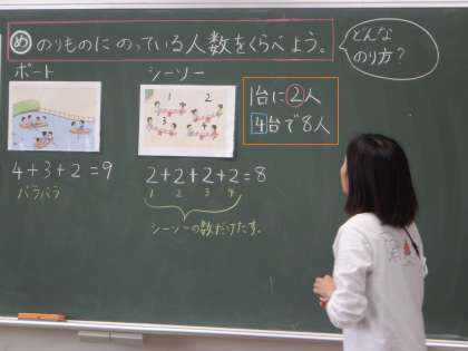 2年算数の学習です。教科書にある絵から、1つ分が何人で、それがいくつ分 を見つけ出しています。