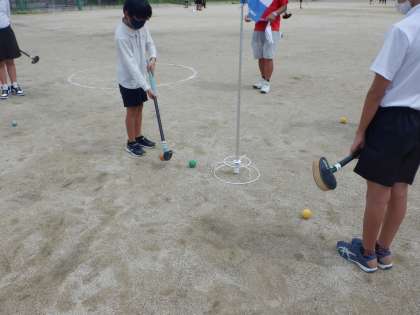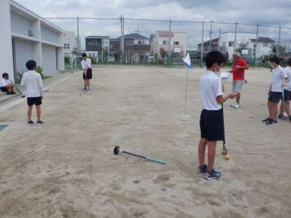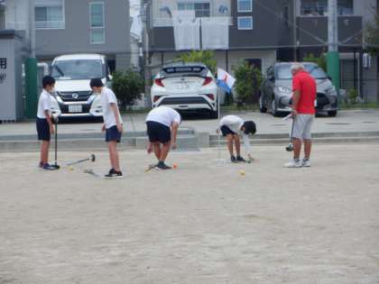 こちらは「福祉」チームです。グラウンドゴルフを体験しています。
