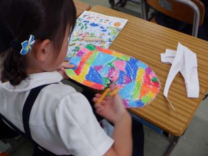 2年2組 図工 ふしぎなたまご 5 公開日 2023/09/15 更新日 2023/09/15 2年 「たまごが『パカッ』とわれると、何かが起こる・・」という想定なので、切り抜いたたまごをさらに「割って」います。