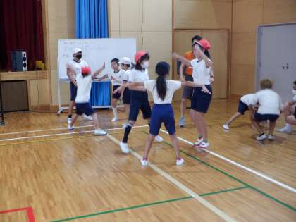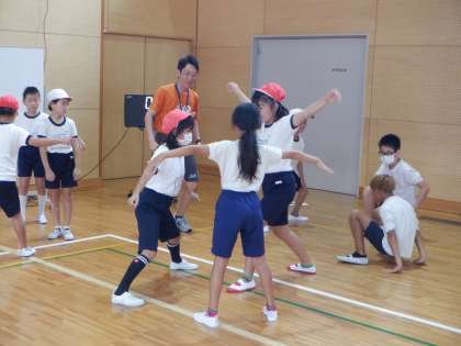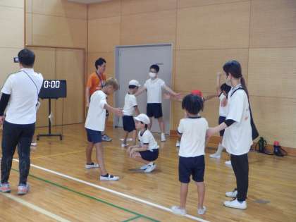 全身を使って「じゃんけん」をするコーナーです。手足の動きや体の姿勢をコントロールする力がつく運動です。