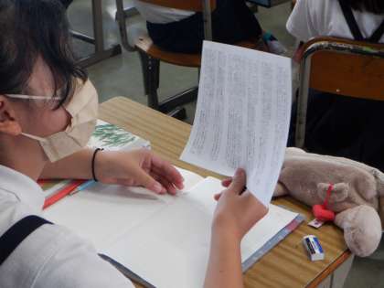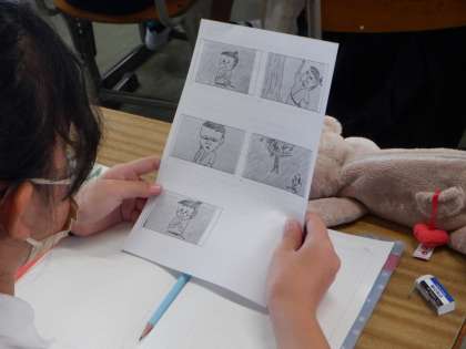 先生が作った紙芝居の「絵」と「台本」がみんなに配られました。紙芝居というゴールをめざして、学習を進めていきましょう。