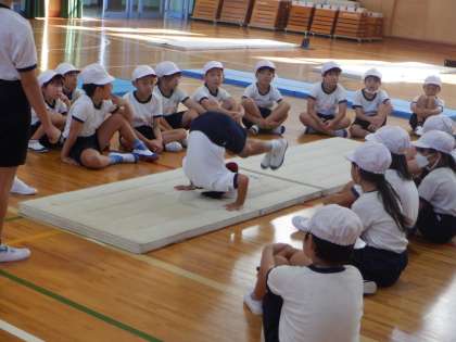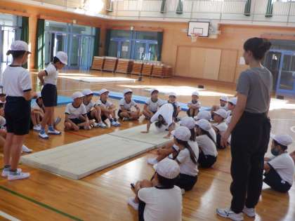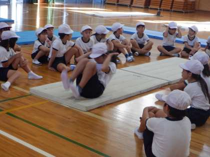 早速、後転の動きをみんなで見ました。いい動きのイメージが持てたでしょうか。