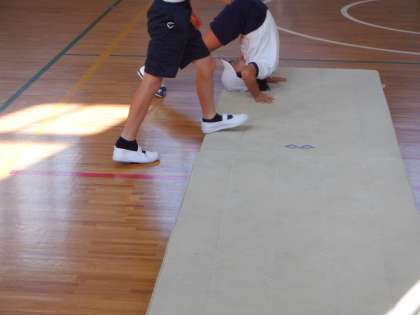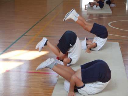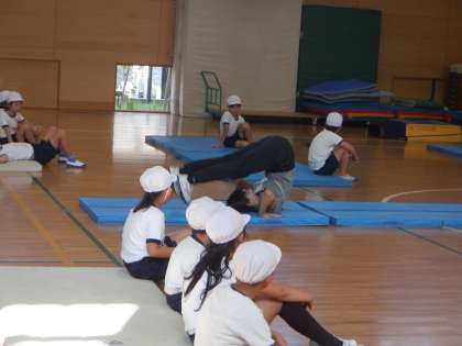 準備運動の中に、後転の動きにつながる感覚づくりの運動を取り入れています。