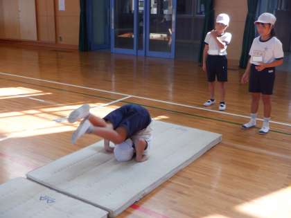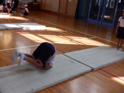 3年3組 体育 後転 9 公開日 2023/09/19 更新日 2023/09/19 3年 スムーズに後ろに回転することができてきました。特に上の写真では、手をしっかり着いて動きをコントロールしています。