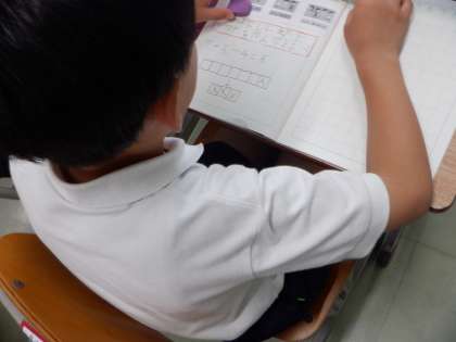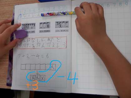 この人は、1人を1つの□(ブロック)で表して考えています。はじめの7人を上に、載ってきた3人を下にかき、降りた4人に×をつけています。式も7+3−4=6と表しています。