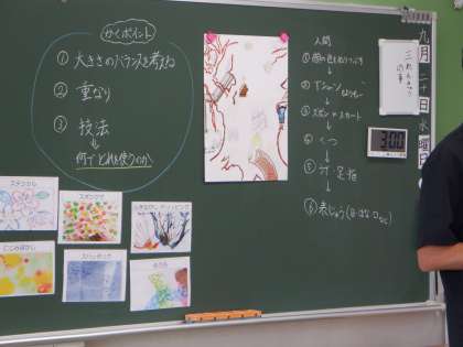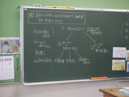 3年図工の学習です。お話をもとに、こんな木がほしい という「木」を描いています。思ったように描けるように、これまでに学んだ技法などが板書されています。