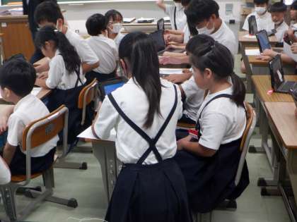 1年生が一人一台のPCの使い方を6年生に教わっています。