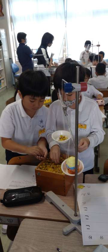 重さの学習です 天秤をつかって、手作りカップケーキの重さを比べています