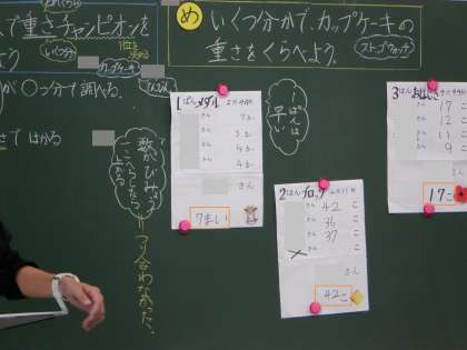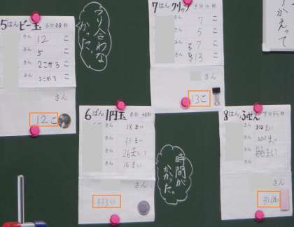 それぞれのグループの中で一番重いのはどれかは分かりました。さらにこの中で一番重いものはどれかを考えますが、この数(オレンジの□)で比べられるでしょうか。