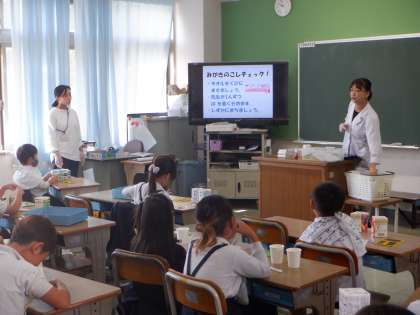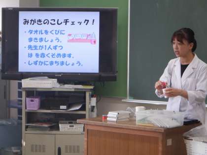 染め出し液を歯につけてから、みがき落とす手順をみんなで確認しています。