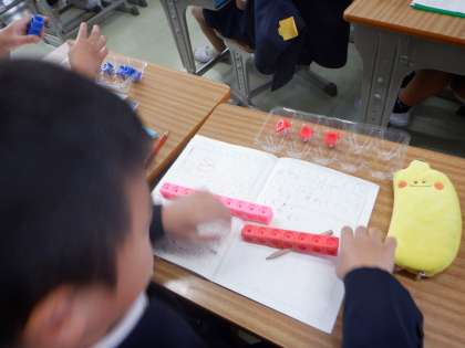 さっそくキューブを動かして考えています。まずは9個を卵パックに入れました。