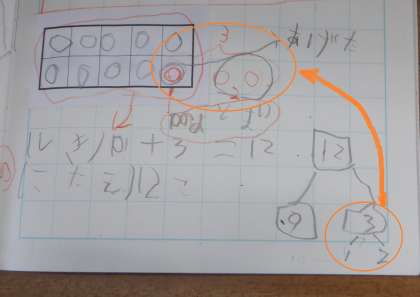 1年2組 算数 たし算 12 公開日 2023/10/16 更新日 2023/10/16 1年 式そのものもサクランボ図で表している人もいました。問題に出てくる数量の関係をきちんとつかんでいることの証拠です。