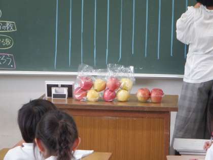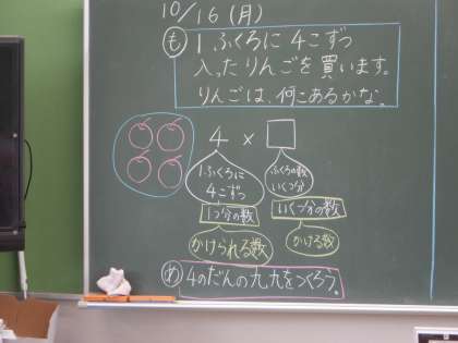 2年2組 算数 かけ算 1 公開日 2023/10/16 更新日 2023/10/16 2年 2年算数の学習です。4の段の九九をつくることがねらいです。机の上には、1袋(1つ分)が4個のリンゴが2袋用意されていました。