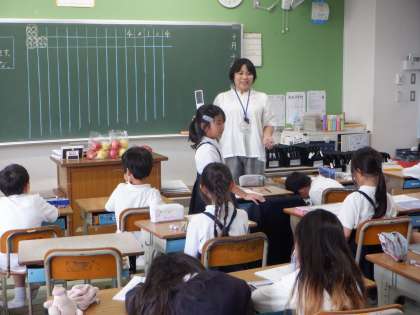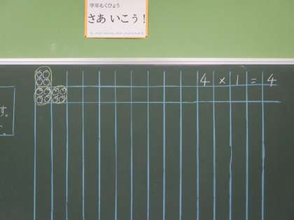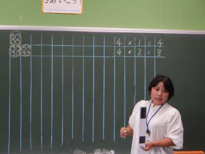 これが2袋あれば、4×2=8 の8個が全部の数です。かけ算の式の表し方も学んでいます。