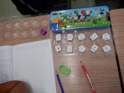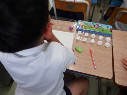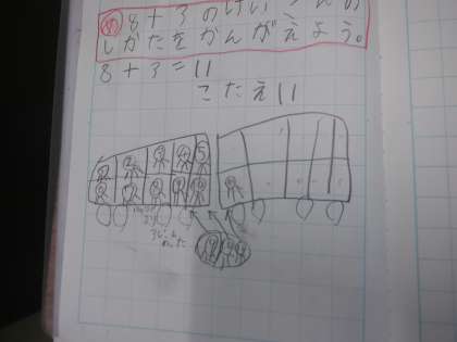 3を2と1に分け、8と2で10を作っています。卵パックをバスに見立てて考えています。