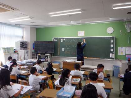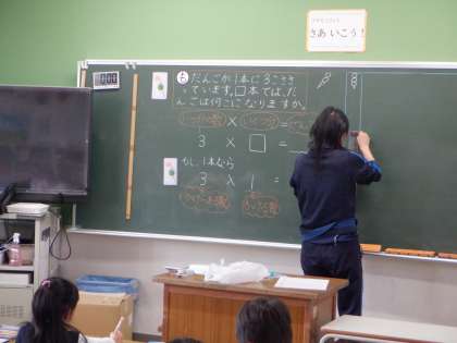 2年算数の学習です。1本に3個あるだんごの本数とだんごの個数をもとに、三の段の九九をつくっていきます。