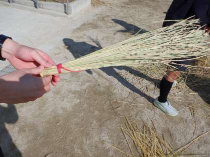 先日稲刈りをさせていただいたときにできた「わら」を使って、ほうき(真ん中の写真)を作っています。
