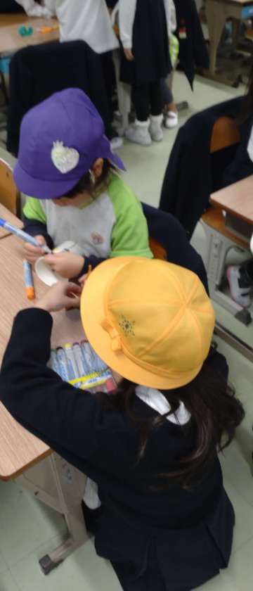 まつぼっくりのけん玉やどんぐりゴマを一緒に作っています