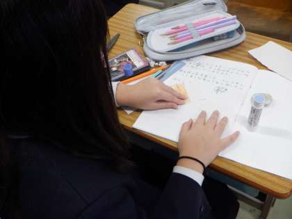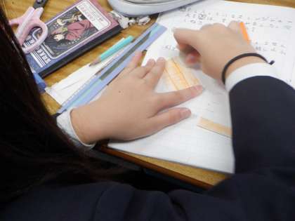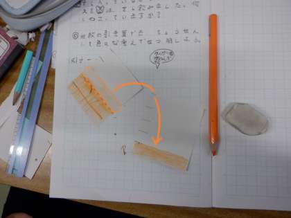 もとあった量の「コップ」を傾けて、5分の1リットル飲んだことを表現しています。楽しそうに学習しています。