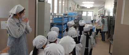 給食場に当番がやってきました 今日の一番乗りは1年3組さんでした〜元気よくいただきます