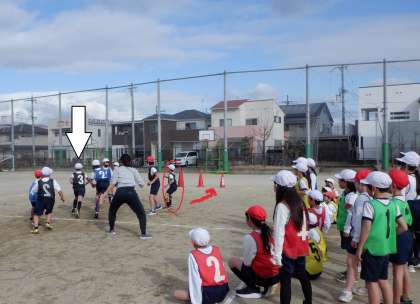 黒の3番(↓)がボールを持っていますが、赤の○のプレーヤーにシュートのチャンスが生まれそうです。先生はゲームの状況を見ながら、見ている人たちにも、どこを見るべきなのかの視点を示す言葉かけをしています。