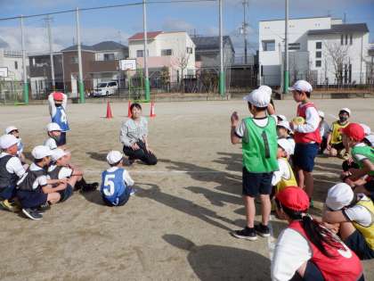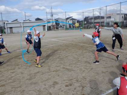 見ていた人が気づいたことを発表しています。相手から離れて(ずれて)パスのコースを作ることの必要性に気づいていました。ゲームの中で困っていたことの答えが、他のチームの動きを見ることで、見つかったようです。