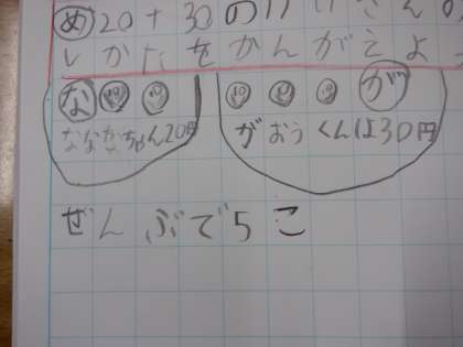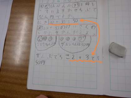 1年2組 算数 たし算 7 公開日 2024/02/06 更新日 2024/02/06 1年 めあてである「計算の仕方」につながる考えが出てきました。この人は、10円玉の数としてかんがえると、2+3=5で計算できると考えています。