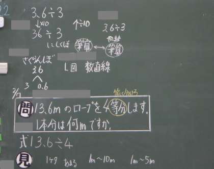 4年算数の学習です。式は13.6÷4と立ったところで、答えの見当をつけているところです。