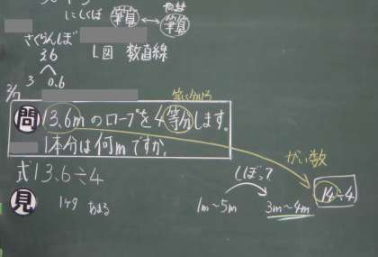 以前に学習した「概数」(およその数)の考え方を使って、見当をつけるとよいことをみんなで確かめました。