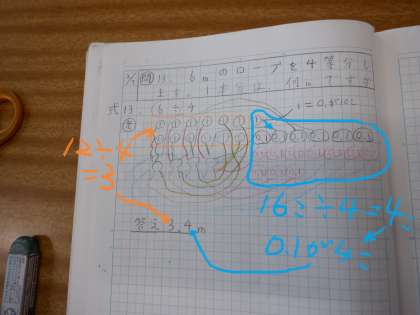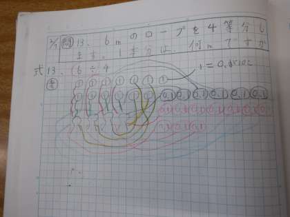 この人も同じような考え方です。計算しやすいように、13.6を12と1.6に分けました。12÷4=3で、まず1人に3mを分けました。次に、残りの1.6mを0.1の16こ分と考えて16÷4=4とし、これは0.1が4つ分なので、あまりの1人分は0.4mです。これらをたして、3.4mという答えを出しました。