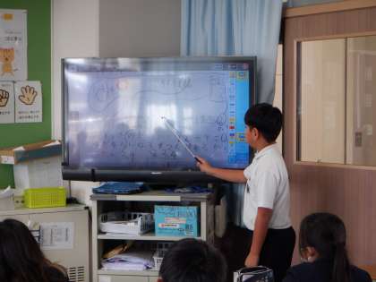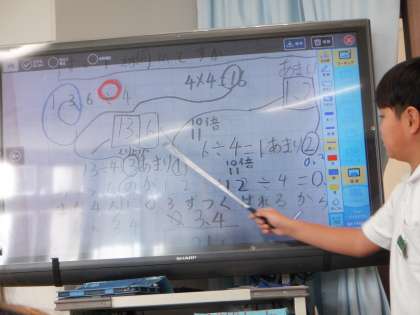個々の考えがまとまったところで、みんなへの発表に移りました。この人も、あまりの長さを0.1mのいくつ分ととらえることで、整数で計算し、答えを出せるように工夫していました。