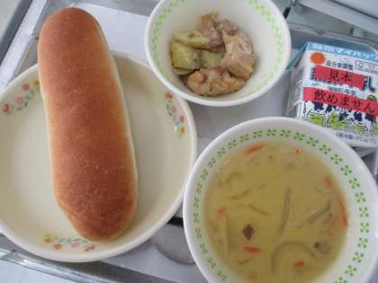 ポタージュ系のスープは6年生のリクエスト献立です。今日は、とうもろこしの裏ごしを使って「コーンポタージュ」にしました。「明日もまたこれ、食べたいな!」ととても喜んで食べていました。