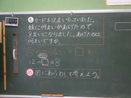 2年4組 算数 1 公開日 2024/02/09 更新日 2024/02/09 2年 2年算数の学習です。「あげた」のでひき算になりそうですが、「残りは何枚か」という簡単な問い方ではありません。そこで、図を使って、問題に出てくる数の関係をとらえることにしました。