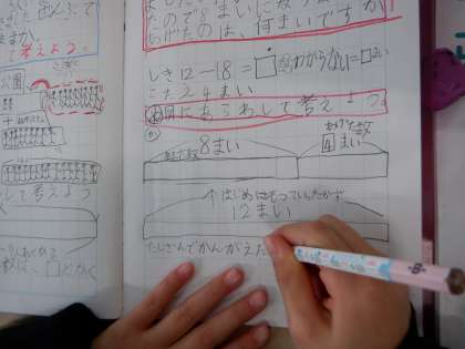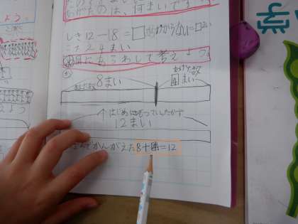 あげた数と残った数をたすとはじめの数になる というたし算の考え方で答えを求めています。