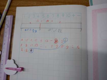 図から式を12−8と立てて、答えを求めました。