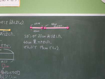 2年算数の学習です。こちらでは、数量の関係をテープ図に表して捉え、式を立てます。