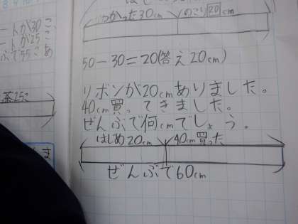 長さは連続した量なので、テープ図がイメージしやすいようですが、しっかり関係をとらえています。
