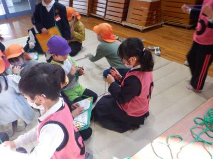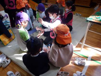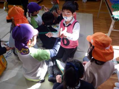 1年 東陶器こども園との交流 1 公開日 2024/02/14 更新日 2024/02/14 1年 インフルエンザの流行で延期になっていた1年生と東陶器こども園との交流会を行いました。あやとりを教えるチームの様子です。