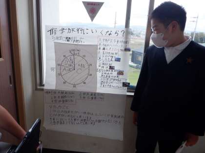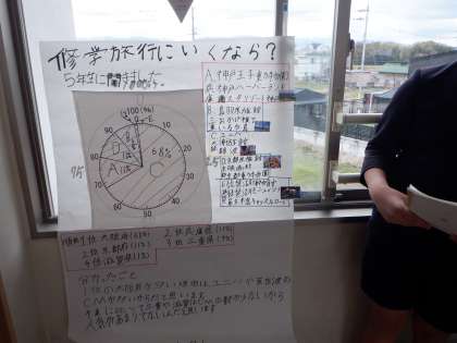5年3組 算数 1 公開日 2024/02/16 更新日 2024/02/16 5年 5年算数の学習です。自分たちが知りたいことや主張したいことについて調査し、その結果を円グラフなどに表して発表する学習です。直前の「割合」の学習を生かした取組です。