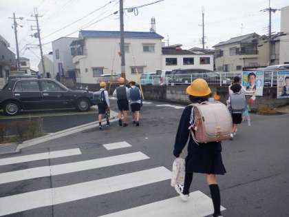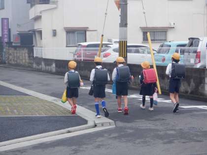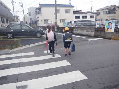 今朝の登校の様子です。雨は上がって、少し青空も見ています。