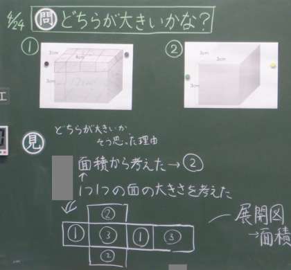 昨日の5年算数の学習です。たて・よこ・高さがそれぞれ2cm・4cm・3cmの直方体と、一辺が3cmの立方体のどちらが「大きい」かを考えています。