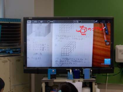 同じように、一辺が1cmの立方体の数で比べている人の考えを、テレビに映して共有しました。