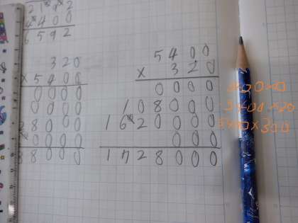 4年4組 算数 2 公開日 2024/04/25 更新日 2024/04/25 4年 オーソドックスに、一の位の「0」をかけ(5400×0)、十の位の「2」をかけ(5400×20)、百の位の「3」をかけて(5400×300)それらをたす形で答えを求めています。