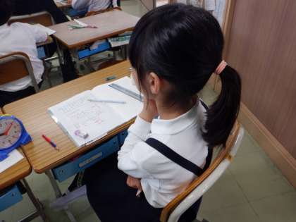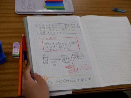 ノートに気づきを整理して、考えをまとめようとしています。