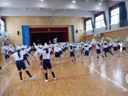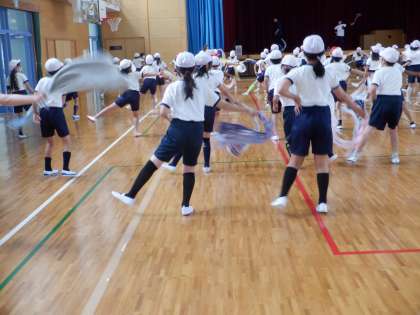 少しむずかしい動きにチャレンジしているところです。みんなでいい演技をつくっていきましょう。
