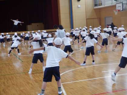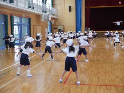 1年生の団体演技の練習の様子です。今日は雨なので、体育館だけでの練習になります。