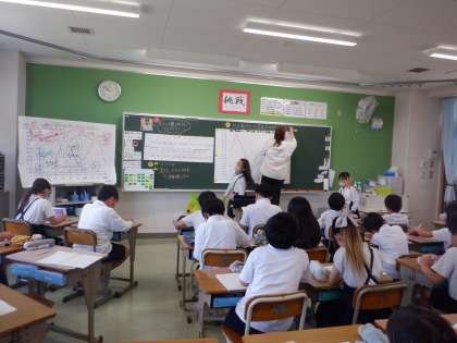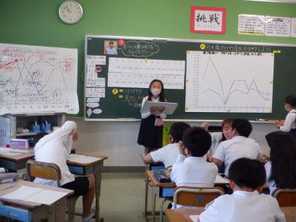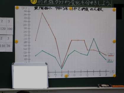 4年算数の学習です。折れ線グラフに表された情報を読み取り、それが何を意味するのかを考えます。