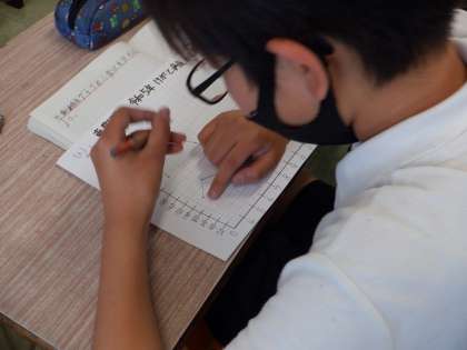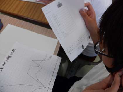 折れ線グラフに表されているのは、昨年度の本校のケガと病気の人数の月ごとの変化です。これを、気温や学校行事を表した資料と見比べて考えています。