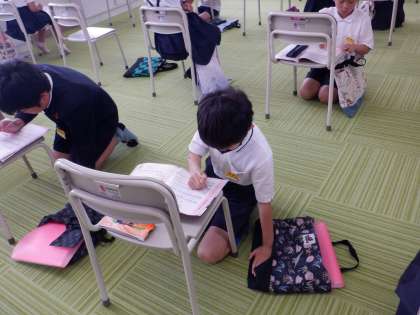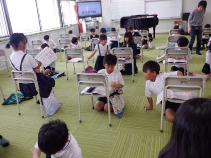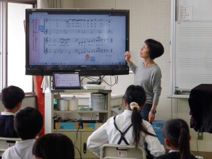 歌に合わせて鍵盤ハーモニカを演奏する部分をみんなで確かめています。