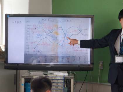 4年2組 算数 1 公開日 2024/05/15 更新日 2024/05/15 4年 4年算数の学習です。データの整理や分析について、折れ線グラフをもとに学んでいます。まずは、前の時間のワークシートをテレビに映してこれまで学んだことを確認しました。
